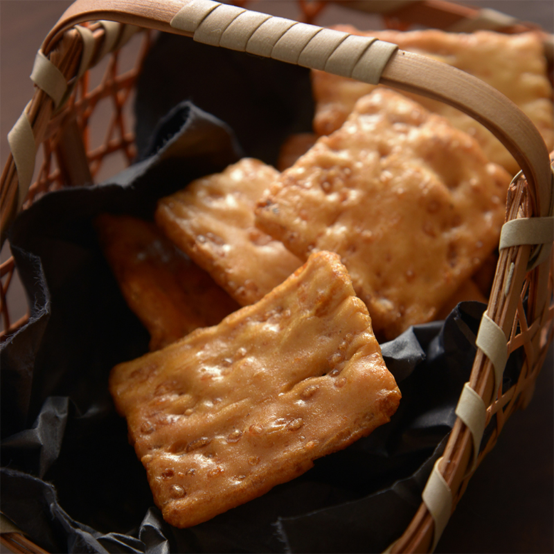 もち米にうるち米を加え、粒を残して香ばしく焼き上げた、薄焼き醤油おかき。 内容量:100g