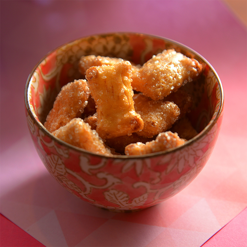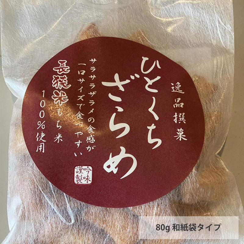 醤油で味付けした生地の上に、ザラメをまとわせた一品です。一口サイズで食べやすく、ついつい手が出ます。 80g:和紙袋タイプ 100g:ビニール袋タイプ